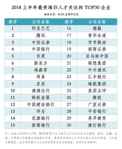 最受海归人才关注的30家企业中 阿里、网易、蚂蚁金服都在杭州
