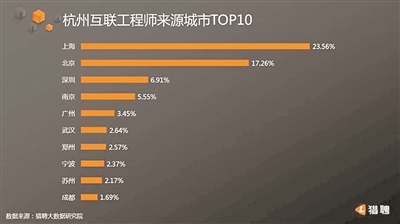 在流入杭州的工程师中,来自上海的最多,达到23.56%;其次是北京和深圳,占比依次为17.21%和6.91%。这意味着,北上深为杭州贡献了近一半的“杭漂”工程师。