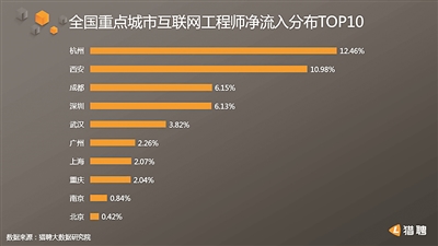 昨日,猎聘发布《2018中国重点城市工程师大数据与调研报告》,分析了2017年一季度到2018年二季度期间,互联网工程师人才净流入分布情况,杭州以12.46%的流入率排名第一。