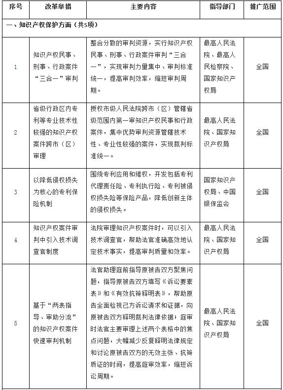 (一)知识产权保护方面5项:知识产权民事、刑事、行政案件“三合一”审判;省级行政区内专利等专业技术性较强的知识产权案件跨市(区)审理;以降低侵权损失为核心的专利保险机制;知识产权案件审判中引入技术调查官制度;基于“两表指导、审助分流”的知识产权案件快速审判机制。