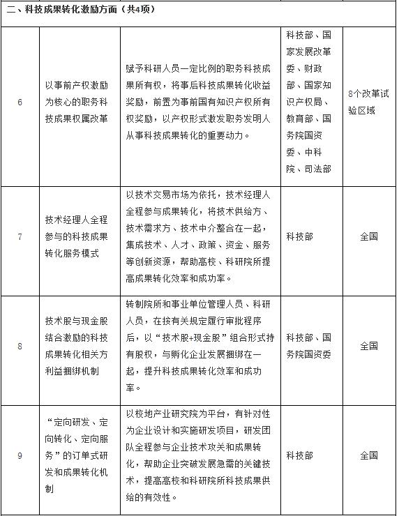 (二)科技成果转化激励方面4项:以事前产权激励为核心的职务科技成果权属改革;技术经理人全程参与的科技成果转化服务模式;技术股与现金股结合激励的科技成果转化相关方利益捆绑机制;“定向研发、定向转化、定向服务”的订单式研发和成果转化机制。
