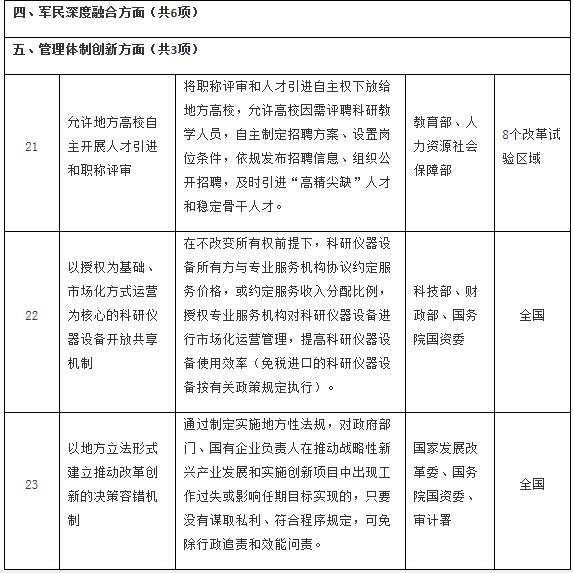 (五)管理体制创新方面3项:允许地方高校自主开展人才引进和职称评审;以授权为基础、市场化方式运营为核心的科研仪器设备开放共享机制;以地方立法形式建立推动改革创新的决策容错机制。