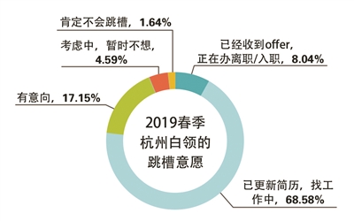 “2019年有跳槽行动的杭州白领高达76.62%,略高于去年同期的71.80%。而有意向的白领为17.15%。肯定或暂时不会跳槽的比例仅为6.23%。”
