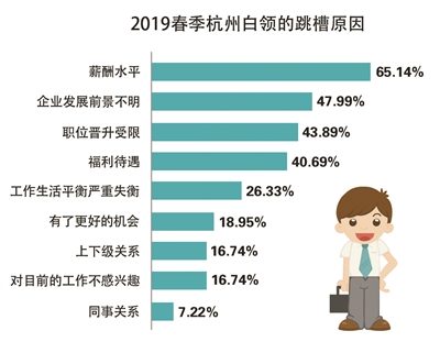 报告显示,2019年春季65.14%的杭州白领表示“薪酬水平”是他们跳槽的主要原因,“企业发展前景不明”和“职位晋升受限”紧随其后,分别为47.99%和43.89%。在智联招聘相关负责人看来,提供一份具有竞争力的收入依然是企业留住人才的根本,同时,还需要让员工感受到企业发展的美好前景。