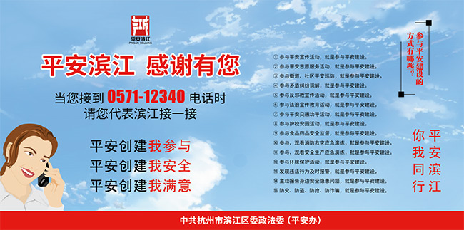 3、平安滨江,人人参与。当您接受安全感满意度调查或接到12340电话时,请正面、积极回答安全、满意、参与等词语。感谢您的支持!
