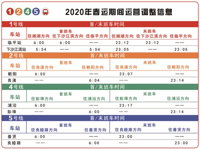 春运客流低谷期(1月24日至1月29日)和平峰期(1月30日至2月7日)不延长运营时间,1、2、4、5号线末班车起点站发车时间在22:30左右。