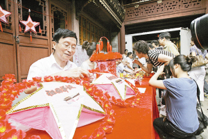来自福明街道福明家园的84岁老人俞爱宝成了非物质文化遗产展览展示活动的明星。看着头发花白的老人戴着老花镜,一针一线地缝制出已经很少见的虎头鞋,不少人拿起相机拍下了这一幕。