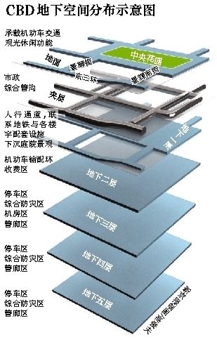 北京CBD管委会相关负责人介绍说,CBD核心区地下公共空间共分为五层。地下一层及夹层为市政管廊层,承载城市雨水、污水、燃气等市政设施的功能。