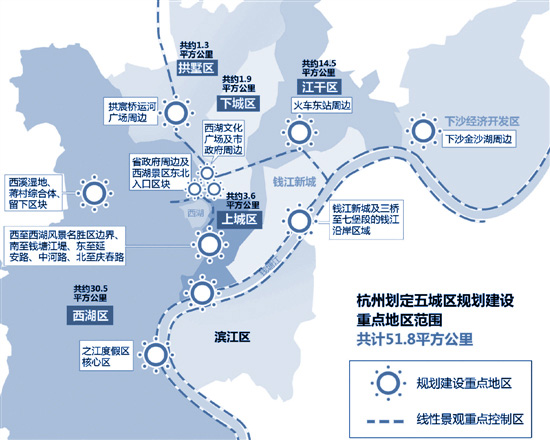 据了解,杭州将按保护山水格局,统筹景观控制;保护老城风貌,落实文物保护、历史保护要求;促进重点区域跨行政区的协调管理的原则,对五城区划定规划建设重点地区范围,共计51.8平方公里。