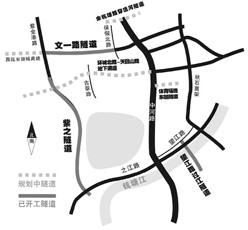 另外还有,西湖湖底隧道(古翠路—望江路,长9000米,双向4车道),在天目山路和延安路,各有一个进出口匝道,构建城市中心区内环道路系统,改善中心区交通条件。