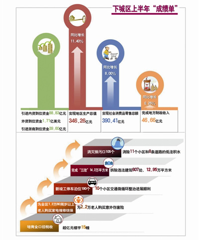 东南形胜,三吴都会,武林自古繁华。近日,下城区九届八次全体(扩大)会议召开,作为我市中央商务区的下城交出上半年“成绩单”——实现地区生产总值346.26亿元,同比增长11.40%;完成地方财政收入46.66亿元,同比增长0.25%;实现社会消费品零售总额390.41亿元,同比增长8.00%。