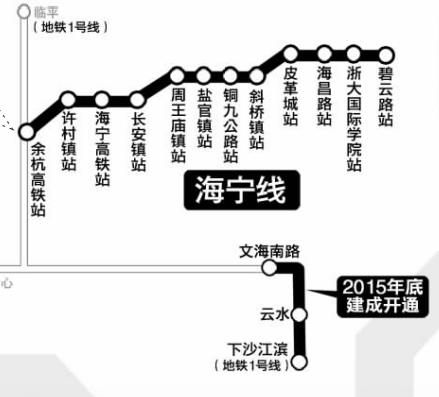 杭州至海宁城际铁路自地铁1号线余杭高铁站起,往东接入海宁的乡镇,向东延伸进入海宁市区,途经中国皮革城,终于碧云路站,全长约47公里,站点共12座,明年上半年开工建设,计划2018年底前建成。