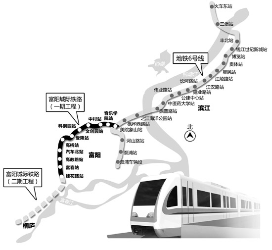 富阳轨道铁路的整个线路,从地铁6号线美院象山站前后引出,往西延伸。和6号线的斜接方案,设计上考虑方便大多数乘客,可实现不换乘进入6号线滨江段各个站点。
