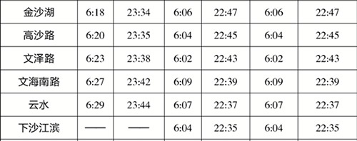 下沙江滨站和云水、文海南加入线网后,1号线各兄弟站的首末班发车时间也会相应微调,列车从文泽路站开到下沙江滨站大概需要10分钟。