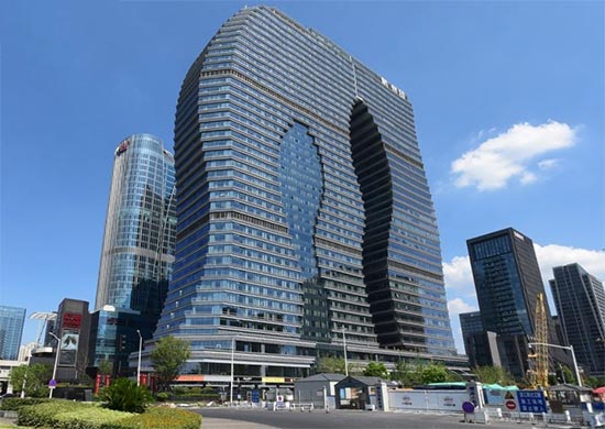 被形容为裤衩的原因,是因为这座百米多高的“杭州印”大楼中间也被挖了空。可是不同于“大裤衩”和“大秋裤”的对称,“杭州印”主体部分似乎被分成了一宽一窄的两幢楼。