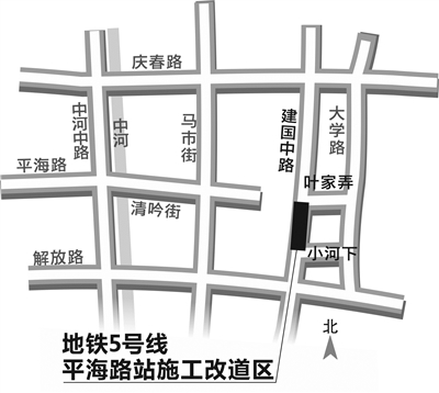 平海路站正确的位置,在建国中路和解放路交叉口往北50米的地方。据现场施工队的工作人员说,这个站点名为工程名,将来还有改名的可能性。“据说有关部门打算将来把平海路延长至建国中路,或者在中河下拉个隧道,直通平海路。所以当时暂定了这个工程名。”该工作人员说。
