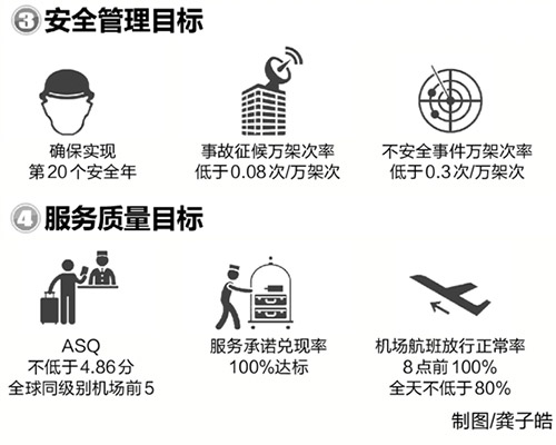 在安全上,杭州机场要打造最安全机场。在服务和颜值上,同样要保持领先水平,争取进入国际机场评比(ASQ)同级别前五,成为最整洁、最有序、最美丽的机场。