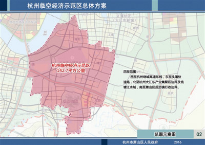 据了解,示范区规划面积142.7平方公里,西至杭州绕城高速东线、东至头蓬快速路,北至杭州大江东产业集聚区边界及钱塘江水域,南至萧山区瓜沥镇行政边界。具体包括杭州萧山国际机场、杭州空港经济区(含南阳街道、靖江街道)、萧山区瓜沥镇头蓬快速路以西的区域及红垦、红山农场绕城高速以东的区域。