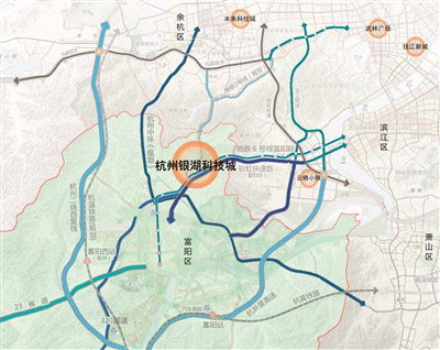 融杭交通,其时已至,其势已成。借助杭州畅通西部三年行动计划、地铁建设五年行动计划机遇,银湖科技城作为富阳融杭交通枢纽作用日益凸显。除了现有的320国道和富闲线两条通道外,彩虹快速路西延工程、地铁6号线、杭州都市高速将于2020年建成通车;地铁3号线小和山支线延伸段正在争取中,未来有希望在银湖科技城核心区实现地铁闭环。园区内公交微循环基本形成,与主城区公交专线不断加密,使银湖与杭州实现公共交通无缝对接。