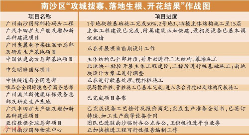 记者了解到,围绕作战图项目实施,南沙完善了专责协调机制,确保措施保障有力。一是成立区“攻城拔寨、落地生根、开花结果”工作指挥部,指挥督导市、区作战图项目推进,由管委会主要领导任总指挥,区政府主要领导任常务副总指挥。