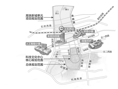 条件成熟后,还要依托区域周边的梦想小镇、阿里巴巴、浙江海外高层次人才创新园,以及杭州师范大学等高等院校的建设,围绕高铁新城规划建设一座“仓前科创新城”。