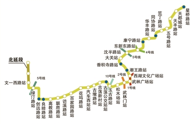 5号线(香樟路站—绿汀路站),将从二期终点绿汀路站继续向西延伸两站,直接深入到余杭街道,延伸长度约5公里,延伸部分主要沿水乡北路、文二西路、水乡北路等道路敷设。