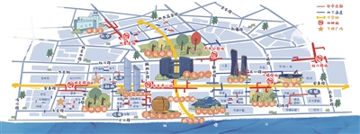 九心:以6个地铁站点和3个公园节点为核心向外扩展;