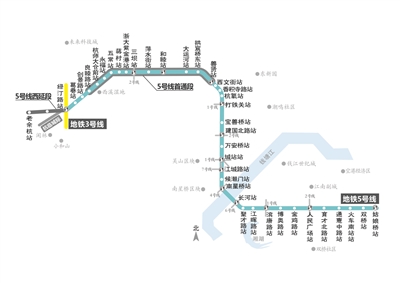 未来,地铁5号线二期通车后,车辆将采用B2型加宽车,初、近、远期均为6辆编组,设计最高运行速度80公里/小时。