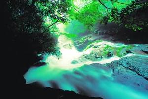 中隐潭,上隐潭下行约5 0 0米处。浓荫复涧,幽寒更甚。涧中巨石卧外,涧水东折西回,瀑布在巨岩上泻奔俯冲,急缓各异,水沫随风飞溅,若雾若雨,富诗情画意。