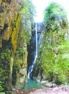 上隐潭,位于东岙车站西南角,从崖上通向深潭石阶2 1 6级。潭上架石桥。陡壁深壑,青苔斑斑,石隙中多苍松挺立,四周藤萝绵密,隐晦迷幻。伫立小桥仰视,瀑布如练,水沫飞溅,凉气逼人。深潭广约半亩,昔为请龙祈雨之地。