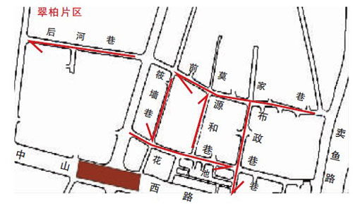 与此同时,以下路段将进行全天24小时交通管制:在前莫家巷(翠柏路—卖鱼路)、后河巷(文化路—翠柏路)自西向东,在花池巷(布政巷—翠柏路)自东向西、在布政巷(中山西路—前莫家巷)、筱墙巷(花池巷—前莫家巷)自南向北,在源和巷(前莫家巷—花池巷)自北向南,禁止机动车通行。