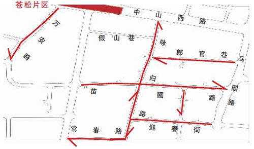 与此同时,以下路段将进行全天24小时交通管制:在苗圃路(马园路—苍松路)自东向西;在郎官巷(咏归路—马园路)、迎春街(咏归路—马园路)、常青路(苍松路—咏归路)自西向东;在咏归路(中山西路—迎春街)自北向南;在万安路(白杨街—中山西路)、咏归路(常青路—迎春街)、苗圃路39弄(迎春街—苗圃路)自南向北,禁止机动车通行。