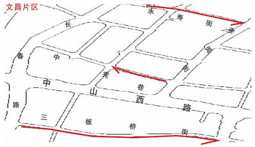 单向交通走向:中宪巷(文昌街—孝闻街)由东向西;永寿街(文昌街—孝闻街)、三板桥街由西向东单向通行。