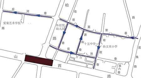翠柏片区的单向交通走向为:前莫家巷—后河巷由东向西;花池巷(翠柏路—布政巷段)由西向东;布政巷(前莫家巷—中山西路段)由北向南;源和巷(花池巷—前莫家巷段)由南向北;筱墙巷(前莫家巷—花池巷段)由北向南。这一地区的管制措施为,0:00-24:00:禁止自西向东在前莫家巷(翠柏路—卖鱼路)通行;禁止自西向东在后河巷(文化路—翠柏路)通行;禁止自东向西在花池巷(布政巷—翠柏路)通行;禁止自南向北在布政巷(中山西路—前莫家巷)通行;禁止自北向南在源和巷(前莫家巷—花池巷)通行;禁止自南向北在筱墙巷(花池巷—前莫家巷)通行。