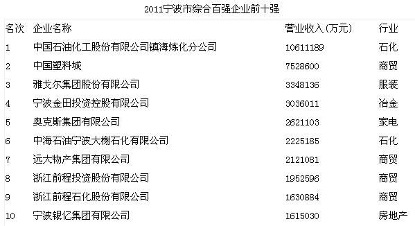 据悉,今年,市综合百强企业排名主要仍以上个年度即2010年企业营业收入为标准。百强企业中,前十强分别是中国石油化工股份有限公司镇海炼化分公司、中国塑料城、雅戈尔集团、宁波金田投资控股有限公司、奥克斯集团、中海石油宁波大榭石化有限公司、远大物产集团、浙江前程投资股份有限公司、浙江前程石化股份有限公司、银亿集团。