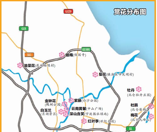 ·观赏地点:北仑九峰山(近百亩,6000余株)、月湖景区、慈湖公园、奉化莼湖镇南岙村梅园、鄞州公园、江北公园、儿童公园等。