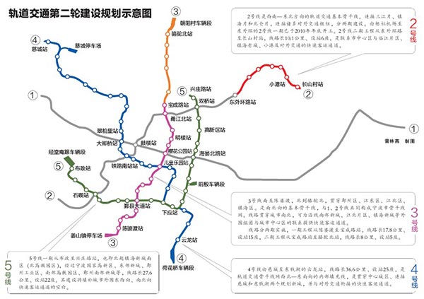 第二轮建设规模将超过第一轮。预计新增总规模100.1公里、总投资640.4亿元。至2020年,我市将形成5条运营线路、总长173.1公里的轨道交通基本网络。根据国家发改委的批复,各线系统规模均按B型车、6辆编组考虑,最高运行时速80公里。据悉,下阶段我市将按照国家发改委批复要求,根据工程条件和周边规划情况,在可行性研究和初步设计阶段进一步明确线站位方案,积极推进各项目工程建设。