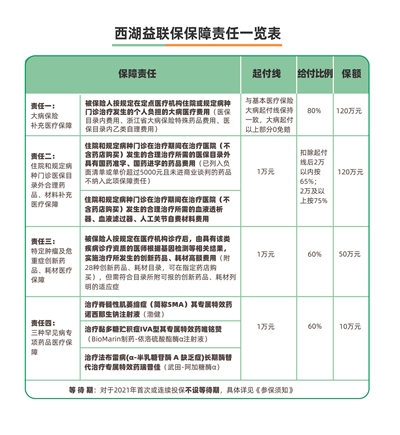 从保障功能来看,“西湖益联保”主要保障四个方面:一是大病保险补充;二是住院和规定病种门诊医保目录外合理药品、材料补充;三是特定肿瘤及危重症创新药品、耗材等;四是3种罕见病专项药品医疗保障。