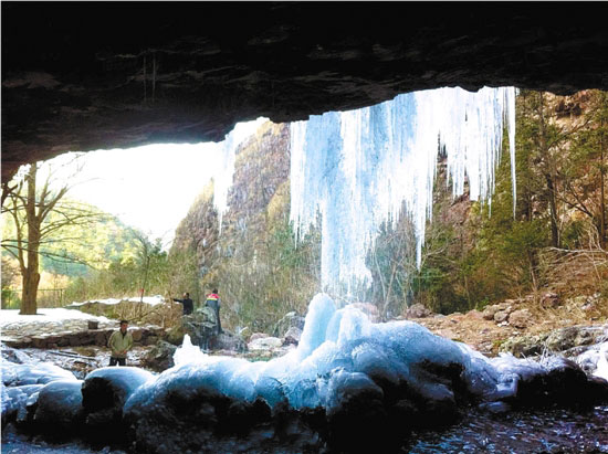 在四明山国家森林公园内有一著名的鹁鸪岩水帘洞,此处海拔约800米,在低温的作用下,鹁鸪岩附近的水流形成了令人动容的冰瀑景观。