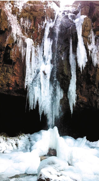 走进洞里,岩缝间悬挂着许多大大小小的冰柱,这些都是岩缝间的渗水遇到空气冷凝后形成的冰凌。洞中的一根冰凌,高有3米左右,已经与地面连接在了一起。